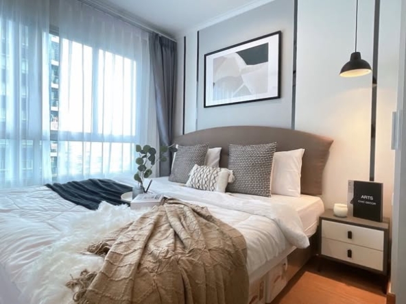 For rent: City Home Sukhumvit condo, just 50 meters from Udom Suk BTS station. This 1-bedroom, 1-bathroom unit spans 50 sqm on the 9th floor and is a corner room. It comes fully furnished with a 6-foot bed, dressing table, three wardrobes, dining table for four, sofa, and storage drawers. Appliances include two air conditioners, a Smart TV, refrigerator, washing machine, and microwave. Rent is 14,500 THB with a minimum one-year contract.