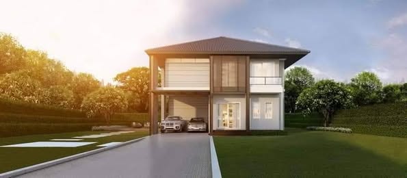 Conveniently located near major roads and local amenities, including schools and shopping centers like Central Pinklao and Tesco Lotus. The house has a garden, a partially furnished interior with wallpaper, and includes 4 air conditioning units. The kitchen is located at the back, which also features a laundry area and additional garden space.